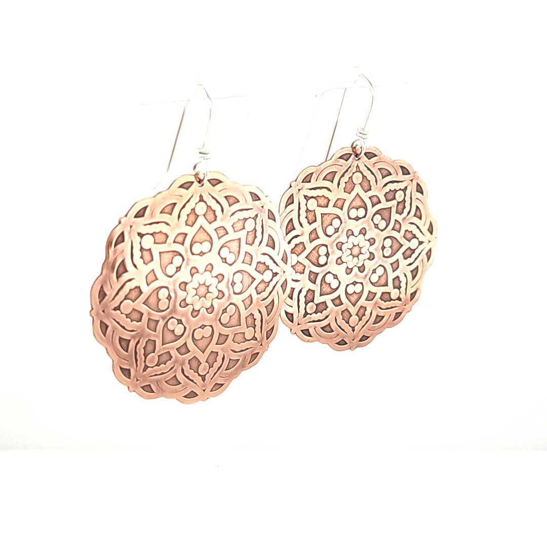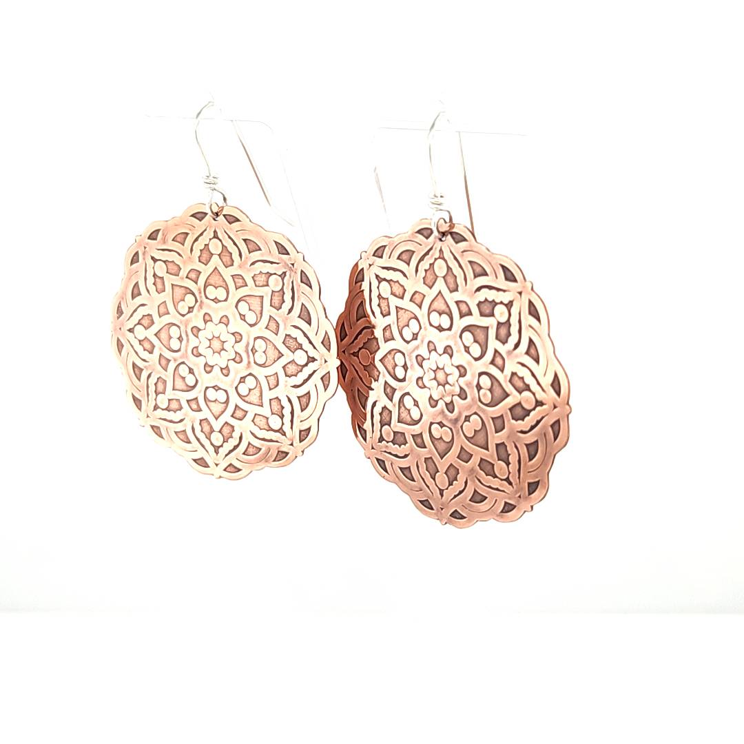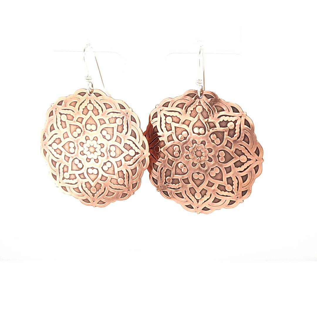 Handmade with precision, the earrings feature a stunning Mandala design in copper. Measuring 1 3/4" wide by 1 3/4" long (2 1/8" long with earwire), these earrings are expertly pressed and cut by hand. They are finished with sterling silver earrwires for an elegant touch.